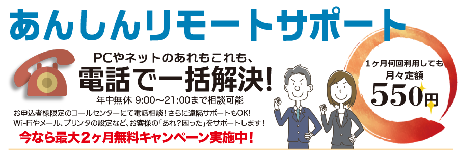 あんしんリモートサポートとは、パソコン・スマートフォンといった通信機器やインターネットの初期設定から使い方について、専門スタッフが遠隔で通信機器の操作を行い、問題を解決するサービスです!何度ご相談されても料金は毎月定額のサービスです!